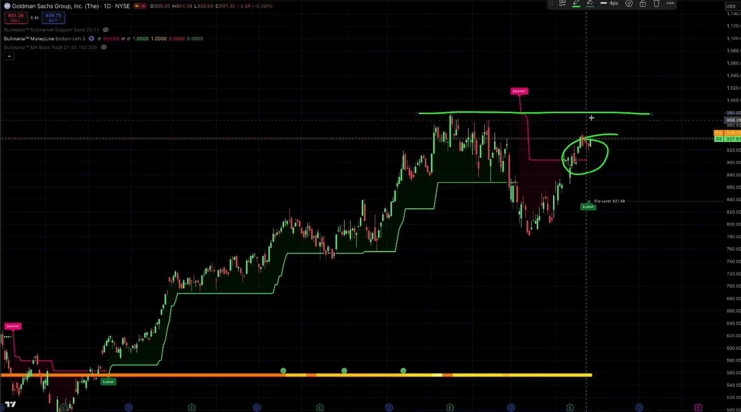 Goldman Sachs is also worth watching. It remains in a broader bullish structure and is attempting to resume after a pullback.