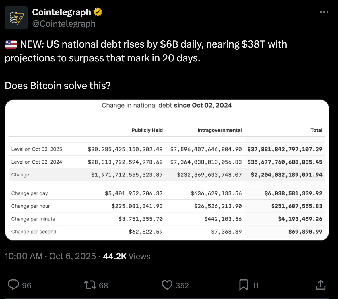 💵 US national debt rising ~$6B per day, crossing $38T this month.